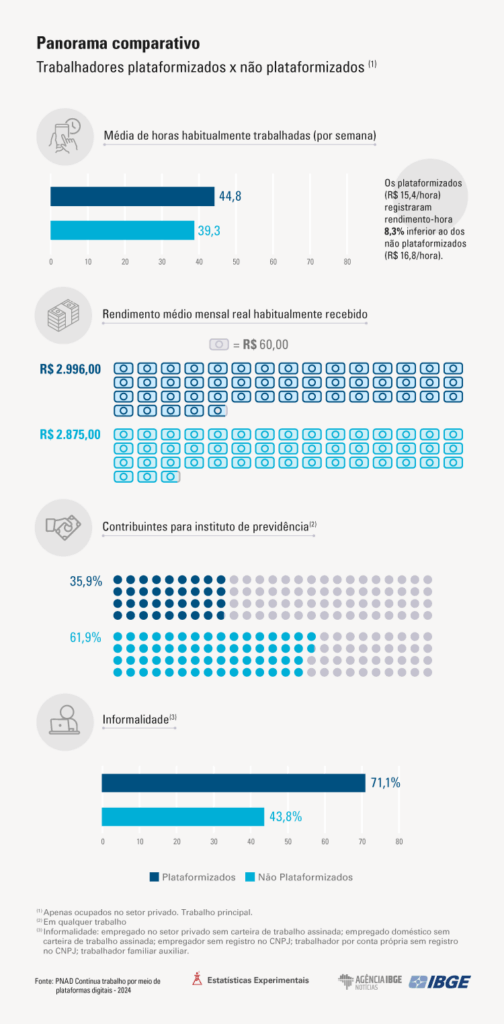 No 3 o trimestre de 2024, o rendimento médio mensal dos trabalhadores plataformizados (R$ 2.996) estava 4,2% maior que o rendimento médio dos não plataformizados (R$ 2.875). No entanto, os trabalhadores plataformizados (R$ 15,4/hora) registraram um rendimento-hora 8,3% inferior ao dos não plataformizados (R$ 16,8/hora), uma vez que sua jornada de trabalho (44,8 horas por semana) era, em média, 5,5 horas mais extensa que a dos não-plataformizados (39,3 horas).